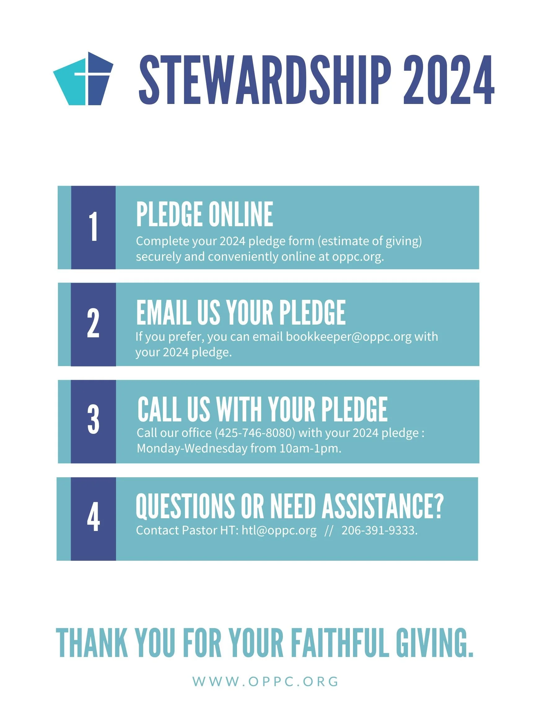 Overlake Park Presbyterian Church also provides electronic giving as an option on Sundays at church—a convenient and secure way to make a one-time or recurring donation. A new “Giving Station” (iPad connected to WiFi), is located in the narthex and is available every Sunday morning.